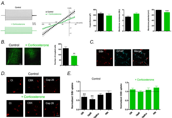 2.1. Chronic Corticosterone Depolarizes Astrocytes and Reduces Gap-Junction Coupling and Hemichannel Activity