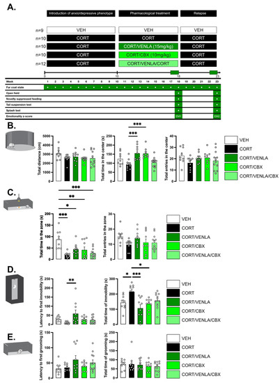 We next carefully followed a group of mice chronically exposed to CORT (or its vehicle) by assessing first the state of their fur coat as a reliable and well-validated index of a depressive-like state [17]. A progressive deterioration was detected in CORT mice compared to control animals, with a significant higher score detected after 10 weeks of exposure (0.07 ± 0.005 (n = 12) vs. 0.36 ± 0.01 (n = 48); p < 0.001)) (Supplemental Figure S1). Once this period was reached, mice still under CORT were separated into four groups, receiving either VEH, VENLA (15 mg/kg/day), CBX (10 mg/kg/day) or the combination of VENLA/CBX for 8 additional weeks. At Week 18, we deployed a comprehensive battery of behavioral tests to address the core symptoms of depression (Figure 2A). On the one hand, we observed that CORT and also VENLA and CBX did not alter locomotor activity (Figure 2B). On the other hand, we confirmed that CORT-exposed mice display neurobehavioral anomalies. These impairments included a high level of anxiety measured in the OF and NSF (Figure 2B,C) and higher resignation evaluated in the TST (Figure 2D) compared to nondepressed control VEH mice. Interestingly, self-care evaluated in the ST was unchanged between groups (Figure 2E). Based on mice behavior in the latter paradigms, an emotionality z-score was then calculated (Figure 3). One-way analysis on emotionality z-score at Week 18 (EM1; Figure 3A) revealed a significant effect of treatment factor (F(4,45) = 13.553, p < 0.001; Figure 2A). As expected and previously reported [10], post-hoc tests showed that chronic CORT significantly increased this score compared to control VEH animals (p < 0.001). Interestingly, the emotionality z-score was completely reversed in CORT/VENLA compared to CORT/VEH (p < 0.001) but not in CORT/CBX (p = 0.26) and CORT/VENLA/CBX mice (p = 0.87).