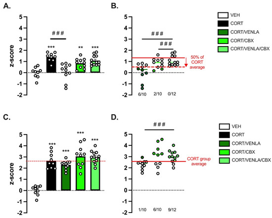 Because in clinical trials antidepressant treatment response is defined as a >50% improvement in the severity of depression [18,19], we used this index to determine the number of responders in each group receiving pharmacological compounds as previously used in preclinical studies [20]. In particular, we used the emotionality z-score of CORT mice as a reference for the pathological state (without treatment) and determined the number of individuals displaying a reduction of z-score of at least 50% of the baseline (i.e., CORT mice). Doing so, we found that CORT/VENLA mice displayed a higher rate of response compared to CORT/VENLA/CBX mice (80% vs. 8%; Fisher’s exact test; p < 0.001; Figure 3B, green dots).