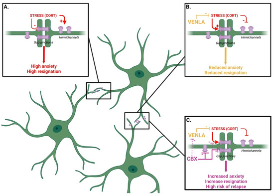 Schematic representation of the potential link between the astroglial connexins and the response to venlafaxine. In line with the literature, chronic stress (modeled here by the long-term exposure to corticosterone, CORT) is believed to block astroglial gap junctions (GJs) while maintaining hemichannels (HCs) opened. This configuration generates a high level of anxiety and resignation (A) suggesting that the impairment of GJ is sufficient to induce a depressive-like phenotype regardless of the functional status of the HCs. On the contrary, the long-term treatment with the antidepressant venlafaxine, either in direct opposition to CORT or by direct modulation of Cx, increases GJ and decreases HC expression/function. This configuration is associated with a reduced level of anxiety and resignation (B). The addition of the Cx blocker carbenoxolone (CBX) attenuates the response to venlafaxine and increases the risk of relapse after treatment withdrawal. Although CBX is not selective to GJs or HCs, this effect could result from direct inhibitory action on GJs (purple arrow). An interaction between CBX and venlafaxine (or CORT) catabolism (hatched purple arrow) is not excluded (C). Figure created with BioRender.com.