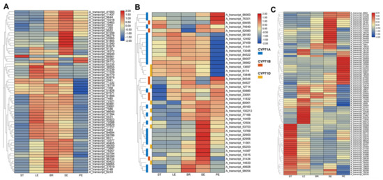 3.4. Tissue-Specific Expression Patterns of TPS/CYP and SDR Genes in O. vulgare ‘HS’