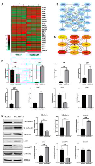 Relationship between LMNA and the EMT-related gene between HCC827 and HCC827/ER cells. (A) Heatmap illustrating the expression of genes related to LMNA and EMT between HCC827 and HCC827/ER cells. (B) An interaction network using the STRING online database and Cytoscape software for 22 common gene signatures involved in resistance to erlotinib and EMT mechanisms. (C) A total of 10 genes were identified as hub genes from 22 candidate genes using the CytoHubba tool in Cytoscape: LMNA, EGFR, PTEN, CDH1, CDH2, VIM, SNAI2, TWIST1, AKT1, and AKT2. (D) Relative expression levels of genes related to LMNA and EMT in HCC827 and HCC827/ER cells were confirmed by qPCR. Data are presented as mean ± SD. ** p< 0.001, *** p < 0.001. (E) The expression of laminA/C, laminB1, E-cadherin, N-cadherin, vimentin, and snail was analyzed by Western blot in HCC827 and HCC827/ER cells. GAPDH was used as a loading control.
