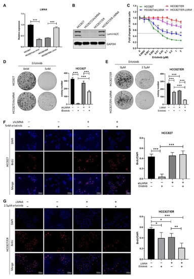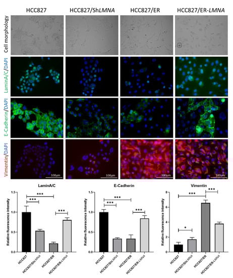 LMNA regulation of EMT in erlotinib-acquired resistant lung adenocarcinoma cells; morphological changes from an epithelial phenotype to a spindle-shaped EMT-like morphology in HCC827 cells after knockdown of LMNA. EMT-like morphology in HCC827/ER cells was reversed by overexpression of LMNA. Levels of laminA/C (green), E-cadherin (green), and vimentin (red) were determined by immunofluorescence assay. Nuclei were visualized using DAPI staining (blue). Data are presented mean ± SD from three independent experiments. Significant differences are indicated as follows: Student’s t-test, * p < 0.05, *** p < 0.001.