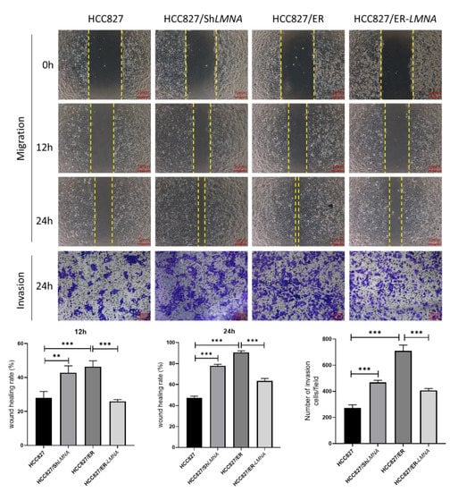 Effect of LMNA on the migration and invasive capabilities of HCC827 and HCC827/ER cells. Representative images show the migration and invasion ability of HCC827, HCC827/shLMNA, HCC827/ER, and HCC827/ER-LMNA cells. Invasive cells were stained and counted under a microscope. Data are presented mean ± SD from five randomly selected visual fields. Significant differences are indicated as follows: Student’s t-test, ** p < 0.01, *** p < 0.001.