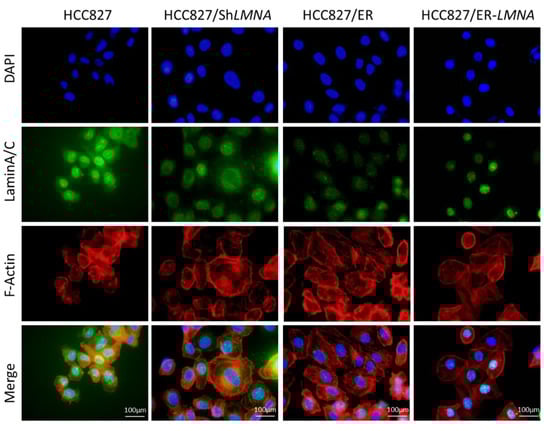 Due to the close correlation between nuclear lamina and the cytoskeleton, we evaluated whether LMNA impacted the shape and volume of the nucleus and cytoskeleton in erlotinib-resistant cells and parental cells. Therefore, the shape and volume of nuclear and cytoskeleton changes were detected in the four indicated cell lines by immunofluorescence. As shown in Figure 6, the nuclear size in HCC827/shLMNA or HCC827/ER cells (low LMNA expression) was greater than that in HCC827 or HCC827/ER-LMNA cells (high LMNA expression). The results suggested that a decrease in LMNA expression resulted in a higher nuclear deformability. For cytoskeleton change, F-actin filaments were evaluated. We found a disrupted organization of F-actin filaments in low-LMNA expression cells, which was rescued by overexpression of LMNA. The F-actin filaments were loosely packed in HCC827/ER and HCC827/shLMNA cells, resulting in resistant cells exhibiting a spindle-shaped EMT-like morphology. As expected, overexpression of LMNA promoted the reorganization of the F-actin filaments to reverse EMT-like morphology. Together, these results suggested that nuclear deformability and cytoskeletal changes depend on LMNA expression in NSCLC.