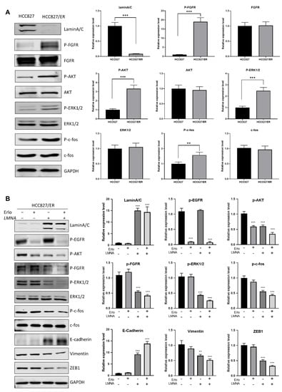 In order to address the molecular mechanism of LMNA in acquired resistance to erlotinib and regulation of migration, expression of several proteins of EMT was measured in erlotinib-resistant cells and parental cells. Western blot results showed that AKT(p-AKT), FGFR (p-FGFR), ERK1/2 (p-ERK1/2), and c-fos (p-c-fos) phosphorylation levels were up-regulated in HCC827/ER cells (low LMNA expression) as compared to HCC827 cells (Figure 7A). Similarly, the same tendency of p-AKT, p-FGFR, p-ERK1/2, and p-c-fos levels was maintained between HCC827 and HCC827/shLMNA cells (Figure S1). These data demonstrated that AKT and FGFR/MAPK/c-fos signal pathways were activated to induce EMT and acquired resistance to erlotinib. Overexpression of LMNA in HCC827/ER cells reduced the phosphorylation of AKT, ERK1/2, c-fos, and FGFR. Furthermore, LMNA overexpression was synergized with 2.5 μM erlotinib treatment to induce lower phosphorylation of AKT, ERK1/2, c-fos, and FGFR compared to overexpression of LMNA alone in HCC827/ER cells (Figure 7B). As expected, overexpression of LMNA increased E-cadherin expression and decreased the expression of vimentin and ZEB1. This effect was enhanced by a combination of 2.5 μM erlotinib. Above all, LMNA overexpression inhibited cell proliferation of erlotinib-resistant cells by downregulation of AKT phosphorylation and also reversed EMT by downregulation of the FGFR/MAPK/c-fos pathways.