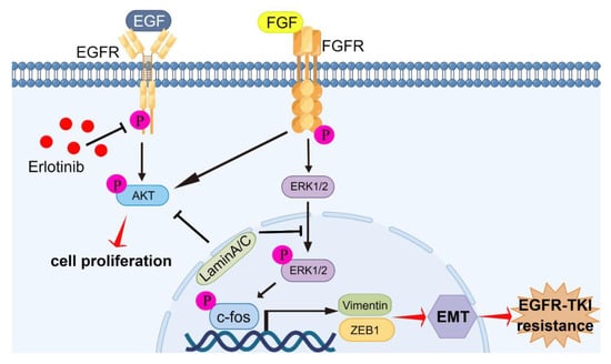 In previous studies, FGFR signaling has been associated with resistance to EGFR-TKIs caused by EMT [30,31,32]. By blocking both EGFR and FGFR, acquired resistance can be inhibited through blocking of the development of EMT in NSCLC with EGFR mutations [22,31]. In this study, we found that FGFR signaling was activated, resulting in acquired resistance of HCC827/ER cells and HCC827/shLMNA cells to erlotinib. The level of EGFR phosphorylation was negatively regulated by treatment with erlotinib in HCC827/ER cells; however, cell proliferation was not inhibited. The reason for this was the compensatory mechanism, which also promoted cell proliferation and migration via the FGFR/MAPK/c-fos signaling pathway. Overexpression of LMNA inhibited phosphorylation levels of FGFR, AKT, ERK1/2, and c-fos. Furthermore, the combination of erlotinib and LMNA significantly enhanced the inhibitory effect on phosphorylation of FGFR, AKT, ERK1/2, and c-fos. The indicated c-fos was a transcription factor and regulated cell proliferation, differentiation, invasion, and metastasis [33]. A previous study demonstrated that c-fos bound to laminA/C and did not bind to related DNA sequences, but this was reversed by phosphorylating c-fos via the ERK1/2 pathway [8]. According to our data, erlotinib-resistant cells reduced laminA/C levels and decreased the binding of c-fos to laminA/C, leading to increased proliferation and migration. On the contrary, laminA/C overexpression inhibited FGFR signaling while increasing c-fos binding to laminA/C, resulting in blocking of the evolution of acquired resistance associated with EMT in NSCLC with EGFR mutations (Figure 8).