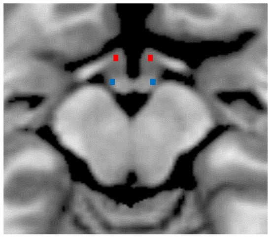 Based on Baroncini et al. [30] and Boes et al. [31] methods, all ROIs were drawn using a T1-weighted template (MNI152 2 mm voxel in FSL software) by two expert neuroradiologist (E.T. & F.C). The center of gravity coordinates in MNI space for the anterior hypothalamic region are x = ±4.4; y = 1.33; z = −14.67, the posterior hypothalamic ROI coordinates are x = ±6.6; y = −7.33; z = −12.67, and those of the whole hypothalamic ROI are x = 0.136; y = 4.68; z = −11.9. The size of the hypothalamic ROIs in the 2 mm space was 6 voxels (48 mm3), 3 per hemisphere, equally for the anterior and posterior ROIs (Figure 1). For each participant and every hypothalamic ROI, we calculated mean FA, MD, RD, and AD values in the hypothalamus by averaging those voxels in the ROI.