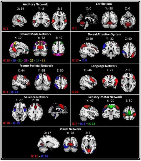 The twenty-one ICs were grouped into the following nine large-scale networks based on their spatial patterns: Auditory (IC2—AN); Cerebellum (IC1—Cb); Default Mode (DMN—IC15, IC20, IC21, IC25, IC27, IC28, and IC31); Dorsal Attention System (IC6—left DAS and IC17—right DAS); Fronto–Parietal (IC3—right FPN and IC23—Left FPN); Language (LN—IC 26); Salience Network (IC 10 and IC19); Sensorimotor (IC7, IC8, IC33); and Visual (IC11—Primary visual (PV) and IC 24—Higher visual (HVN)) networks (Figure 2).