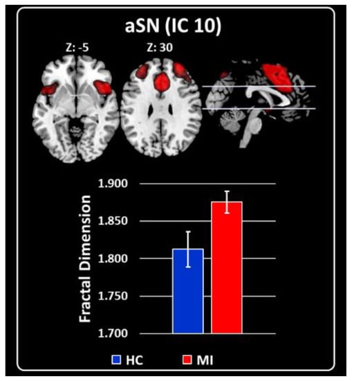 The general linear model for FD values showed that MI differed from HC only in the anterior part of the SN (aSN, IC10: F = 10.58, p = 0.001), with higher FD values of aSN in MI than HC (Cohen’s d = −1.24; Figure 3).