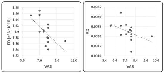 A moderate significant negative correlation was found between the severity of migraine pain, as assessed by 0–10 VAS and FD values of IC10 (r = −0.613, p = 0.018, Figure 4, Upper Left Panel). When considered as a whole ROI, a moderate significant negative correlation was found between hypothalamic AD and VAS (r = −0.613, p = 0.015, Figure 4, Upper Right).