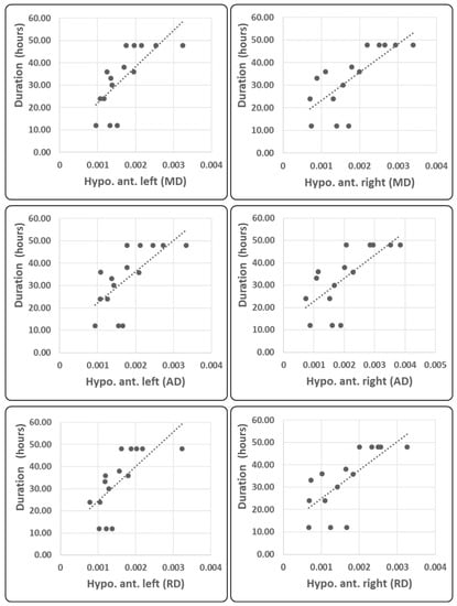 Linear regression analysis between duration of migraine attacks in hours and bilateral anterior hypothalamic MD, AD, and RD values.