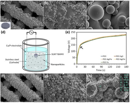(a–c) The surface morphology of selective-laser-melted Ti6Al4V scaffolds at different magnifications, imaged using SEM. (d) An illustration of the PEO setup with the titanium scaffold and the stainless steel cathode in the Ca/P-containing electrolyte doped with NPs for surface biofunctionalization. (e) The V-t transients were recorded during the surface biofunctionalization of the titanium scaffolds using the electrolytes containing Fe NPs and Ag NPs of varying concentrations. (f–h) The surface morphology of the PEO scaffold groups after being subjected to 180 s of surface biofunctionalization were imaged at different magnifications using SEM and analyzed with EDS.