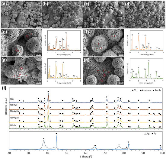 SEM confirmed that the additions of Ag and Fe NPs to the electrolyte did not change the surface morphology of the biofunctionalized scaffolds (Figure 2a–d). NPs were tightly embedded in the porous TiO2 surface layer. Moreover, Ag NPs can be identified on PEO Ag3 specimens (Figure 2e), Ag and Fe NPs on PEO Ag2Fe (Figure 2f), PEO Ag1Fe specimens (Figure 2g), and Fe NPs on PEO Fe specimens (Figure 2h).