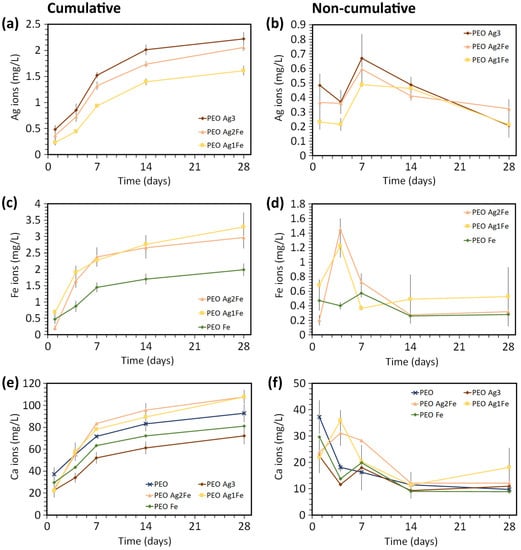 The (a,c,e) cumulative and (b,d,f) non-cumulative (a,b) Ag, (c,d) Fe, and (e,f) Ca ion concentrations released from the surface-biofunctionalized scaffolds during immersion over 28 days.