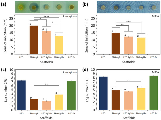 The zones of inhibition around the biofunctionalized scaffolds after 24 h of incubation on agar plates swabbed with a 107 CFU/mL of (a) P. aeruginosa and (b) MRSA. The quantitative bactericidal activity of the scaffolds against (c) 2.6 × 106 CFU of P. aeruginosa after 1 h of incubation and (d) 1.3 × 109 CFU of MRSA after 4 h of incubation. **** = p < 0.0001, *** = p < 0.001, ** = p < 0.01, * = p < 0.05, # = **** vs. PEO and PEO Fe groups, γ = ** vs. PEO group and **** vs. PEO Fe group, n.s. = not significant.