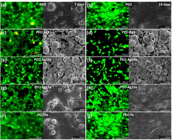 The cytocompatibility of the surface-biofunctionalized scaffolds towards preosteoblasts MC3T3-E1 under osteogenic conditions. The viability of cells was assessed by live/dead staining and the morphology of cells were imaged using SEM after culture for 7 and 14 days on the (a,b) PEO, (c,d) PEO Ag3, (e,f) PEO Ag2Fe, (g,h) PEO Ag1Fe, and (i,j) PEO Fe specimens.