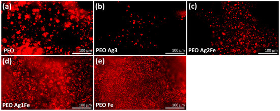 Following 24 h of incubation, all the scaffolds containing Ag NPs (i.e., PEO Ag3, PEO Ag2Fe, and PEO Ag1Fe) showed inhibition activity against P. aeruginosa (Figure 4a) and MRSA (Figure 4b). On the contrary, such inhibition zones were not observed for the control group (i.e., PEO) and for the scaffolds containing Fe NPs only (i.e., PEO Fe). The PEO Ag3 specimens exhibited the largest sizes of the inhibition zones. The size of the inhibition zone was smaller for the specimens with lower Ag NPs concentrations (i.e., PEO Ag2Fe and PEO Ag1Fe).