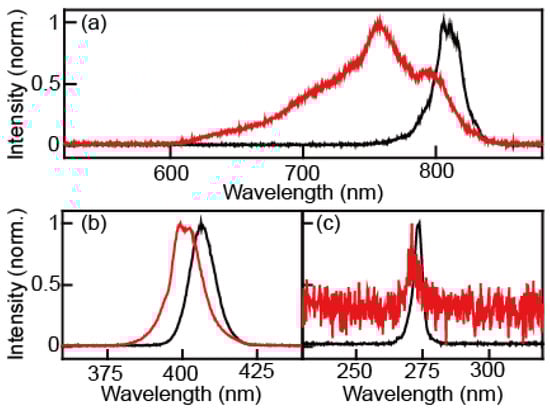 Spectral changes after plasma generation. (a) Fundamental source before (black) and after (red) the air plasma. (b) Second harmonic source before (black) and after (red) the air plasma. (c) Third harmonic source before (black) and after (red) the air plasma.