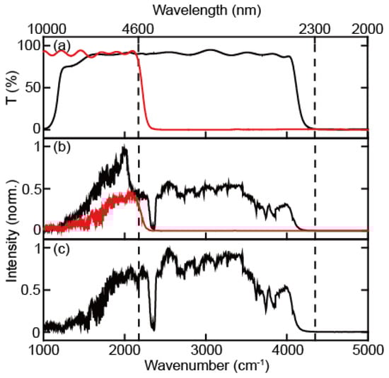 (a) Transmittance spectrum of 2.4 μm IR long-pass filter (black) and 4.5 μm IR long-pass filter (red). (b) Continuum IR spectra obtained with 2.4 μm IR long-pass filter (black) and 4.5 μm IR long-pass filter (red). (c) Corrected continuum IR pulse spectrum, where the spectrum under and over 4.5 μm are obtained with 4.5 μm and 2.4 IR long-pass filter, respectively.