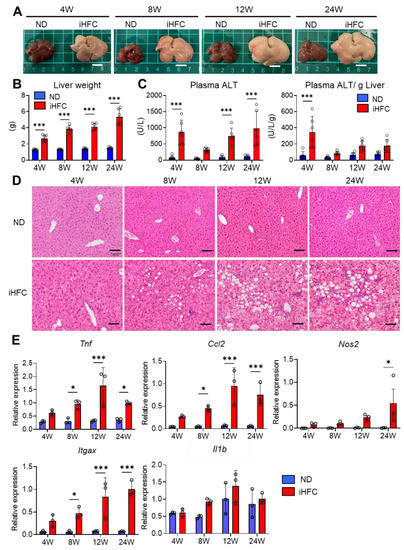 An iHFC (high-fat/cholesterol/cholate-based) diet induces steatohepatitis in the liver of Tsumura-Suzuki non-obese (TSNO) mice. (A) Representative photos of the livers from TSNO mice fed with the normal diet (ND) or iHFC diet for the indicated time periods. Scale bars, 1 cm. (B) Liver weights of TSNO mice fed with the ND or iHFC diet for the indicated time periods (n = 6 per group). (C) Left, plasma alanine aminotransferase (ALT) levels were measured for TSNO mice fed with the ND or iHFC diet for the indicated time periods (n = 6 per group). Right, plasma ALT levels per liver weight (g) were also calculated (n = 6 per group). (D) Representative images of hematoxylin and eosin-stained sections of the livers from TSNO mice fed with the ND or iHFC diet for the indicated time periods. Scale bars, 100 μm. (E) RT-qPCR of TNF-α (Tnf), iNOS (Nos2), CCL2 (Ccl2), CD11c (Itgax), and IL-1β (Il1b) mRNA in the livers from TSNO mice fed with the ND or iHFC diet for the indicated time periods (n = 3 per group). Data are shown as means ± SD. * p < 0.05, *** p < 0.001. Statistical significance was evaluated by 2-way ANOVA followed by post hoc Sidak test.