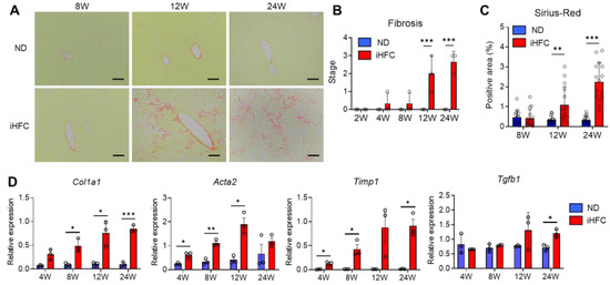 The iHFC diet induces advanced fibrosis in the liver of TSNO mice. (A) Representative images of Sirius red-stained sections of the livers from TSNO mice fed with the ND or iHFC diet for the indicated time periods. Scale bars, 100 μm. (B) Liver fibrosis (0 to 4) was assessed according to the criteria proposed by Kleiner et al., as described in the Materials and Methods (n = 3 per group). (C) Five locations were photographed per three sections per each group. Then, positive areas for Sirius red were measured at 15 locations using ImageJ software, and the mean and SD were calculated. (D) RT-qPCR of collagen type 1 (Col1a1), αSMA (Acta2), TIMP-1(Timp1), and TGF-β (Tgfb1) mRNA in the livers from TSNO mice fed with the ND or iHFC diet for the indicated time periods (n = 3 per group). Data are shown as means ± SD. * p < 0.05, ** p < 0.01, *** p < 0.001. Statistical significance was evaluated by 2-way ANOVA followed by post hoc Sidak test.