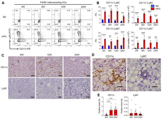 To identify the cell populations that comprise the F4/80Int/CD11bInt-Hi recruited macrophages, we gated F4/80+ cells as live single cells, excluding KCs (Figure S8), the majority of which are recruited macrophages, and assessed the expression of the monocyte/macrophage markers Ly6C and CD11c. In mice consuming an ND, there were very few Ly6C- or CD11c-expressing cells among the F4/80+ cells, excluding KCs (Figure 5A). In contrast, the percentages and numbers of CD11c+/Ly6C− and CD11c−/Ly6C+ cells were markedly increased by iHFC diet-feeding (Figure 5A,B). Between 8 and 24 weeks of iHFC diet-feeding, the number of CD11c+/Ly6C− cells decreased, while the number of CD11c−/Ly6C+ cells did not significantly change (Figure 5B). Immunohistochemical analysis showed that CD11c+ and Ly6C+ cells accumulated in the liver during iHFC diet-feeding (Figure 5C,E). CD11c+ cells accumulated in a mesh-like pattern, surrounding the lipid droplets, thereby forming hCLSs (Figure 5D). In contrast, the Ly6C+ cells were small and accumulated in doughnut-like inflammatory lesions, with a lipid droplet in the center of each (Figure 5D). We also found that the percentage and cell number of dendritic cells (F4/80−/CD11b+/CD11c+/Ly6C−) were increased by iHFC diet-feeding (Figure S9). However, they were less than those of CD11c+ recruited macrophages (Figure S9). These results suggest that F4/80+ recruited macrophages consist of two different macrophage subsets, CD11c+/Ly6C− and CD11c−/Ly6C+ cells, in the livers of iHFC-fed mice. Furthermore, their location in the liver suggests that these two macrophage subsets may have different roles in the development of NASH.