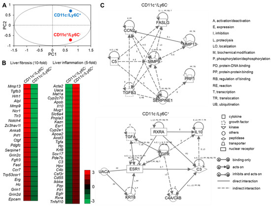 To elucidate the roles of CD11c+/Ly6C− and CD11c−/Ly6C+ recruited macrophages in the pathogenesis of NASH, we performed RNA sequence analysis to compare the gene expression patterns of these subsets. Principal components analysis (PCA) showed that there were differences in the gene expression patterns of CD11c+/Ly6C− and CD11c−/Ly6C+ cells (Figure 7A). We next performed a bioinformatic analysis to identify the molecular/cellular functions and gene networks of the differentially expressed genes in the two macrophage subsets. We focused on the gene ontology (GO) term “Inflammatory response”. Among these, we found a cluster of genes involved in liver fibrosis, with 24 genes showing 10-fold higher expression in CD11c+/Ly6C− cells than in CD11c−/Ly6C+ cells (Figure 7B). These data are consistent with our findings that CD11c+ cells constitute hCLSs and colocalize with collagen fibers (Figure 5C,D and Figure 6). We also found a cluster of genes involved in liver inflammation, with 30 genes showing five-fold higher expression in CD11c−/Ly6C+ cells than in CD11c+/Ly6C− cells (Figure 7B).