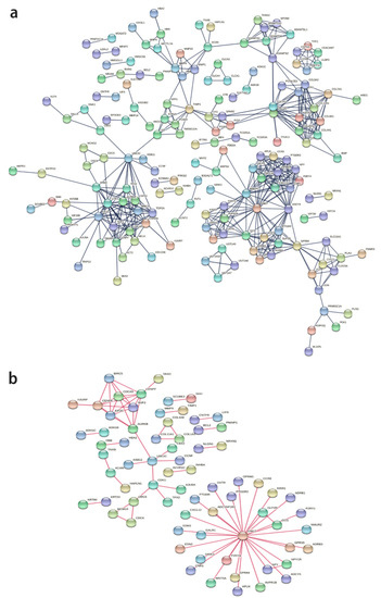 - Szklarczyk, D.; Gable, A.L.; Lyon, D.; Junge, A.; Wyder, S.; Huerta-Cepas, J.; Simonovic, M.; Doncheva, N.T.; Morris, J.H.; Bork, P.; et al. STRING v11: Protein-protein association networks with increased coverage, supporting functional discovery in genome-wide experimental datasets. Nucleic Acids Res. 2019, 47, D607–D613. [Google Scholar] [CrossRef]