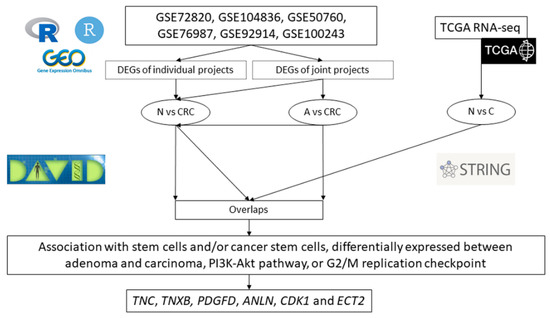 Among the identified DEGs in the joint GEO projects analysis, also the DEGs identified comparing adenoma and corresponding normal mucosa as well as overlap between carcinomas and corresponding normal tissue were considered for further validation. In the PEI analysis from the adenoma versus carcinoma comparison, the PI3K-Akt signaling pathway, associated with CSC [45,46,47] was chosen for identification of candidates for further validation. In the PPI analysis CL:12302 mixed, incl. mitotic cytokinesis, and G2/M DNA replication checkpoint and CL:12305 mixed, incl. mitotic cytokinesis, and G2/M DNA replication checkpoint terms were chosen for further validation. The DEGs from the aforementioned pathway and from the PPI analysis were then checked for references associating them with CSC or stem cell terms and checked for presence in the Stemformatics database [48]. Finally, six genes were identified for further validation, namely anillin, actin binding protein (ANLN), cyclin dependent kinase 1 (CDK1), epithelial cell transforming 2 (ECT2), platelet derived growth factor D (PDGFD), tenascin C (TNC) and tenascin XB (TNXB). The summary of comparisons is represented in Figure 6.