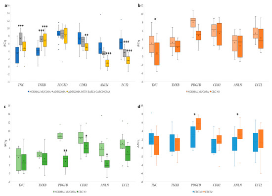 Expression of six genes (TNC, TNXB, PDGFD, CDK1, ANLN, ECT2) in colorectal cancerogenesis: (a) ∆Cq of six genes in normal mucosa, adenoma, and adenoma with early carcinoma; (b) ∆Cq of six genes in colorectal cancer without lymph node metastases (CRC N0) compared to corresponding normal mucosa; (c) ∆Cq of six genes in colorectal cancer with lymph node metastases (CRC N+) compared to corresponding normal mucosa; (d) ∆∆Cq of six genes in colorectal cancer with (CRC N+) compared to those without lymph node metastases (CRC N0). Legend: x, mean; ◦, outlier; *, p ≤ 0.05; **, p ≤ 0.01; ***, p ≤ 0.001.