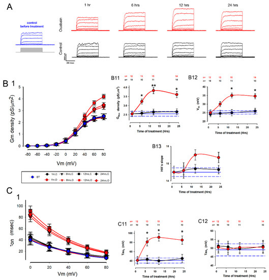 Treatment with ouabain also affected the activation kinetics of potassium currents (Figure 2(C1)): the average value of τ0 increased significantly from 6 h of treatment (Figure 2(C11)), while τv did not change significantly at any treatment times (Figure 2(C12)).