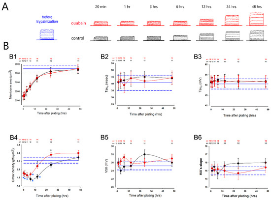 Ouabain accelerated the recovery of potassium currents after trypsinization. (A) The series of representative currents, recorded at different times after trypsinization and re-seeding at confluence. At the top, in red, are shown the series of currents recorded from the cells treated with ouabain. At the bottom, in black, are shown the series of currents without treatment with ouabain. The series shown on the left in blue corresponds to a series of currents recorded from a cell in a mature monolayer, before trypsinization. (B) Graphs (B1–B6) compare the average values (±SE) of the (B1) membrane surface, (B2) τ0, (B3) τv, (B4) density of gmax, (B5) V50 and (B6) Hill’s slope. In all these graphs, the red circles correspond to cells treated with ouabain and the black ones, to untreated cells. The blue lines show the corresponding values obtained from cells before trypsinization. Black asterisks indicate a statistically significant difference between the control and ouabain-treated groups for each time. Blue asterisks denote a statistically significant difference as compared to the mean value before trypsinization (blue lines). The numbers at the top of the graphs indicate the number of repetitions. (*) denotes p < 0.05.