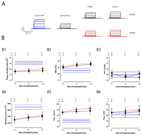 Figure 4 shows in panel A, the series of potassium currents representative of the different conditions. The series (in blue) on the left side, again, was obtained from a cell in MEMs before trypsinization. The next series (control, 0 h) was obtained from a cell 2 days after having been seeded at low density but before adding the ouabain to the extracellular medium. The other series correspond to what was obtained at the times of 6 and 12 h with or without treatment with ouabain. In panel B are shown different graphs (B1–B6) that compare the average values (SE) of each parameter, with and without ouabain (red and black circles), at 6 and 12 h of treatment, as well as those from cells in MEMs (horizontal blue lines).