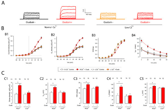 In the absence of extracellular calcium, ouabain had no effect on the potassium currents of cells in MEMs. (A) Series of currents representative of the different experimental conditions. The pair of series on the left side were obtained from cells in a mature monolayer, which had been either untreated or treated with ouabain for 6 hours. The pair of series on the right side was obtained from cells in mature monolayers from which calcium had been removed from the extracellular medium before treatment with ouabain. (B) The graphs (B1–B4) show the relationship between the different parameters (current density, conductance density, g/gmax and tauon) and the transmembrane voltage for the different experimental groups (with and without calcium, and with and without ouabain). The symbols for each group are shown in the box located below (B2,B3). (C) The bar charts (C1–C5) show the average values (±SE) obtained in each experimental group as well as the result of the statistical comparison between them. The numbers above the bars indicate the number of repetitions in each group. The asterisks above the horizontal lines denote a statistically significant difference between the means (±SE) of treated versus untreated cells; (*) indicates a p < 0.05.