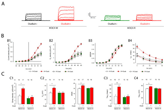 Figure 6 shows, in panel A, a representative series obtained under the same experimental conditions, of MDCKW and MDCKR cells. Panel B shows in graphs (B1–B4) the relationship between voltage and current density, conductance density, g/gmax and tauon, while panel C shows histograms that compare the different parameters, both in MDCK-W cells and in MDCK-R. As indicated there, in MDCKW cells, ouabain produced statistically significant changes in all parameters, but not in MDCK-R cells.