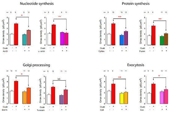 Figure 7 shows the average value (±SE) of conductance density, for each of the four different combinations (of ouabain and inhibitor), as well as the result of the statistical comparison between the groups treated with ouabain, for the different inhibitors described above. As shown there, actinomycin significantly inhibited the increase in conductance density induced by ouabain, while CX5461 did not produce a statistical inhibition of the response. The two blockers of protein synthesis, cycloheximide and puromycin, produced a very significant reduction in the response induced by ouabain, which strongly suggests that the synthesis of new protein units is required for this response to occur. This is further reinforced by the result with brefeldin A, which also produced a significant reduction in the stimulus produced by ouabain. On the other hand, both exocytosis inhibitors produced a significant reduction in the effect induced by ouabain, indicating that this cellular process is required for the incorporation of new molecular components.