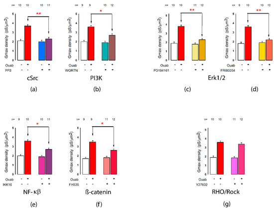 We also tested if β-catenin plays a role by probing the effect of FH535, an inhibitor of β-catenin-mediated transcription [78,79]. As Figure 8f shows, this caused a significant (p < 0.05) decrease in the response induced by ouabain, indicating the role of β-catenin in the signaling cascade.