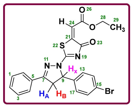 According to Scheme 1, a new series of pyrazolo-oxothiazolidine derivatives was synthesized in three steps. Initially, the Claisen–Schmidt condensation of acetophenone or para-methoxy acetophenone (1a, b) and aromatic aldehydes (2a–2h) in the presence of sodium hydroxide in ethanol resulted in 1,3-diphenylprop-2-en-1-ones (chalcones, 3a–3n). Then, the intermolecular cyclization of different chalcone derivatives (3a–3n) with thiosemicarbazide (4) produced pyrazole compounds (5a–5n) in refluxing ethanol under basic conditions. Finally, the reaction of compounds 5a–5n and diethyl acetylenedicarboxylate (6) is accomplished under reflux conditions in ethanol, to form pyrazolo-oxothiazolidine derivatives (7a–7n) in reasonable yields (80–92%). The structural confirmation of all synthesized compounds (7a–7n) was verified through the spectroscopic analysis utilizing FT-IR, 1H NMR, and 13C NMR. To comprehend the structural identification of the synthesized target compounds, we have presented a structural interpretation of one of the target compounds (7a). Molecule 7a was obtained in 84% yield as a white solid with a melting point of 242–244 °C. FT-IR spectroscopy was used to examine the molecular vibrational studies to confirm various functionalities. The aliphatic C-H stretching vibrations were observed at 2974 cm−1. The stretching bands for conjugated C=O group appeared at 1694 cm−1. The other significant absorption bands in the IR spectrum emerged at 1602 (C=C, alkene), 1548, 1498 (C=C, aromatic), 1489 (C=N, stretching), 1218 (C-O, stretching), 1177, 1114, 1073, 1010 (C-N stretching and aromatic C-H out of plane bending), 823, 767, 757 (aromatic C-H out of plane bending), 689 (C-Br stretching), which prove the existence of functional groups such as pyrazole, ester, alkene, and aromatic in this molecule. The number of proton-containing atoms in the produced molecules was measured using 1H NMR spectroscopic techniques. There are two phenyl rings in the target compound 7a. In the aromatic region, the two multiplet peaks at δ 7.14–7.18 (m, 2H, H-13 & 17), and 7.83–7.85 (m, 2H, H-14 & 16) belonged to the aromatic ring which holds the bromo group at the para position, whereas five protons of second phenyl ring represented by multiplet at δ 7.46–7.58 (m, 5H, H-1, 2, 3, 4 & 6). In the up-field region of the spectrum, the signals at δ 1.37 (t, J = 8 Hz, 3H, CH3) and 4.34 (q, J = 7.2 Hz, 2H, CH2), exposed the presence of methyl and methylene groups, which split triplet and quartet, respectively. At δ 6.93 (s, 1H, H-24), there was a distinct singlet signal for vinylic hydrogen. The typical ABX system, which is associated with the CH2 and CH protons of the pyrazoline ring, was clearly detected in the predicted regions. The HA proton was observed at δ 3.43 (dd, J = 18, 4 Hz, 1H, H-8A), the HB proton appeared at δ 4.03 (dd, J = 18, 12 Hz, 1H, H-8B), and the HX emerged at 5.85 (dd, J = 11.2, 4 Hz, 1H, H-9), due to vicinal coupling with two magnetically non-equivalent protons of the methylene group at position 4 of the pyrazoline ring. Furthermore, the carbon backbone of the produced target compound 7a was studied using the 13C NMR technique. Due to some duplets for magnetically equivalent carbons that reduced the total number of resonances in the molecule, the 13C NMR spectra showed a total of eighteen carbon resonances. Two resonances for the phenyl ring which holds the bromo group at the para position were observed at δ 127.68 (C-13 & C-17) and 132.39 (C-14 & C-16), while another phenyl ring emerged at δ 127.52 (C-4 & C-6), 129.11 (C-1 & C-3), and 129.43 (C-2). The two carbonyl carbons (C-25) and (C-20) appeared at δ 166.59 and 173.81 ppm, whereas two imine carbons (C-7) and (C-18) were observed at δ 160.79 and 178.68 ppm. Four quaternary signals were characterized at δ 122.65 (C-15), 132.16 (C-5), 138.15 (C-12), and 146.52 (C-21). One signal at δ 118.17 ppm belonged to the methine carbon (C-24). There were four peaks in the aliphatic region that were distinguished by the methyl and methylene carbons at positions 14.23 (C-29), 43.30 (C-8), 61.75 (C-28), and 63.38. (C-9) (Figure 2).