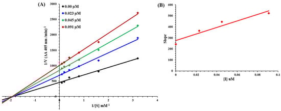 Presently, the most active compound 7g was considered for the mode of inhibition of CIAP. The capacity of the compound to inhibit the free enzyme and enzyme-substrate complex was determined in terms of EI and ESI constants, respectively. The kinetic research of the enzyme by the Lineweaver–Burk plot of 1/V versus substrate p-NPP 1/[S] in the presence of different inhibitor concentrations gave a series of straight lines as shown in Figure 3A. The results of compound 7g showed that the compound intersected within the second quadrant. The analysis confirmed that Vmax was reduced to new growing doses of inhibitor, on the other hand Km stays the same. This behavior suggests that compound 7g inhibits the alkaline phosphatase non-competitively to shape an enzyme-inhibitor complex. A secondary plot of slope against the concentrations of inhibitor confirmed enzyme-inhibitor dissociation constant (Ki) Figure 3B. The kinetic results are presented in Table 2.