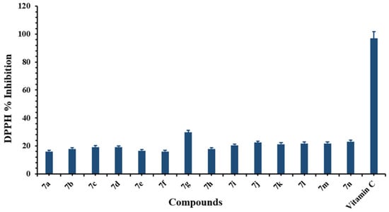 All synthesized target compounds were assessed for 2, 2-diphenyl-1-picrylhydrazyl (DPPH) free radical scavenging ability. From our results, all of the compounds showed activity (Figure 4), but the most effective compound (7g) showed a bit of inhibition (29.7%) compared to the others at the concentration of 100 µg/mL. Ascorbic acid (vitamin C) was employed as a reference to evaluate the radical scavenging activity.