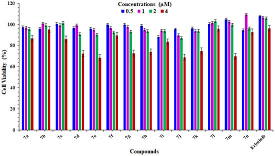 In this experiment, all fourteen pyrazolo-oxothiazolidine derivatives (7a–7n) after confirmation activity against in vitro ALP enzyme inhibition were carried out to check their toxic effect on the human osteosarcoma MG-63 cell lines using the MTT assay technique. At first, four concentrations (0.5, 1, 2, and 4 µM) were chosen for each compound, along with a positive control (erlotinib), and all compounds and the standard drug were treated and incubated for 24 h. Normal control was considered to be 100% viable without any treatment. The viability of the cells was examined after incubation, and the results are presented in (Figure 5). From these results, it is clear that all compounds have no toxic effect on the cells, and even at the concentration of 4 µM, the cells were viable up to >70% except the compounds 7e, 7j, and 7m. However, at the first three treatments, all the compounds along with the standard drug showed >90% viability. These findings suggest that these compounds could be employed as a safe target for drug design within pharmaceutical approaches.