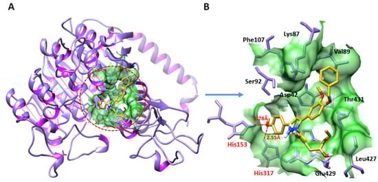 Based on in vitro (IC50) results, the 7g-docked complex was selected to understand the binding interaction behavior of the compound against ALP. Docking analysis showed that 7g was actively confined within the active binding region of ALP (Figure 7). In detail, the SAR study showed that four hydrogen bonds were observed in the 7g-docking complex. The oxygen atom of 7g forms two hydrogen bonds with His_153 and His_317 having bond lengths 1.78 and 2.55 Å, respectively. The importance of these amino acid residues in binding with other ALP inhibitors has also been well documented [,]. The comparative binding energy and SAR analysis showed a significance of 7g and may be considered as a potent inhibitor of the enzyme. The rest of all docking complexes have been shown in Supplementary Data (Figures S43–S56).