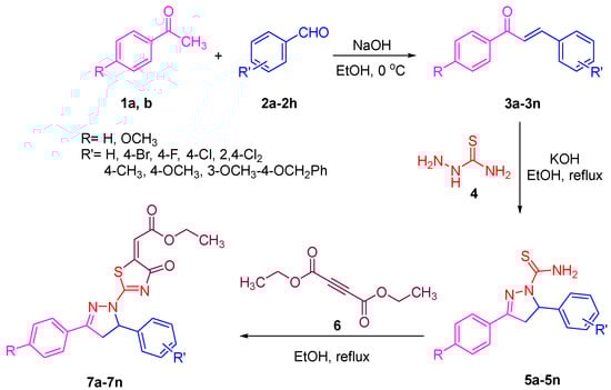 3.2.3. Procedure for Synthesis of 1-Thiazolyl-2-Pyrazoline Derivatives (7a–7n)