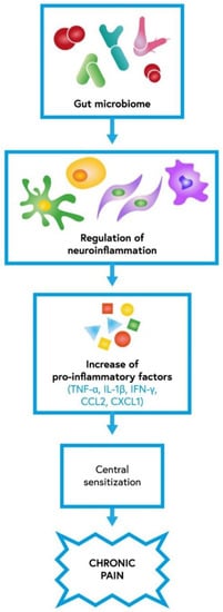 The role of gut microbiota in neuroinflammation which contributes to central sensitization underlying chronic pain; IL-1β—interleukin-1β, IFN-γ—interferon-γ, TNF-α—tumor necrosis factor-α, CCL2—C–C motif chemokine ligand 2, CXCL1—C-X-C motif chemokine 1 [12].
