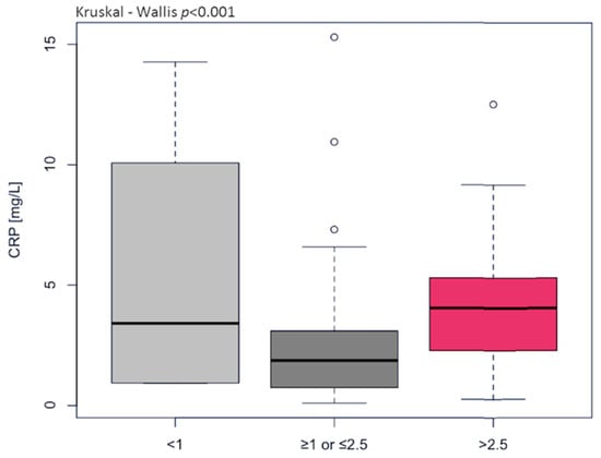 The white blood cell count fell within the referential range in all participants. Neutrophils, monocytes, and platelets tended toward high values in HGI, whereas lymphocyte count was significantly higher in HGI compared to the LGI group (Table 2). MPV, as a marker of platelet activation, was below the referential values in 99% of the study sample and tended toward low values by CRP ≥ 3 mg/L, which plays a role in the potentiation of thrombin-induced platelet activation. The parameters of the red blood cells also fell within the referential range except for HB concentration, which was below the referential values in 21% of the study sample, which confirms the existence of anemia in old age [17]. However, the observed low HB level did not relate to inflammatory status.