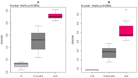 The immune risk profile (IRP) expressed as the ratio of total CD4+ to total CD8+ in low-grade inflammation group (A) and high-grade inflammation group (B) differentiated to reference ranges for CD4/CD8 (normal ≥ 1 or ≤2.5, inverted < 1, high > 2.5).