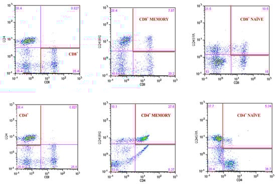 The 8-parameter CyFlow Space Sorter flow cytometer SysmexPartec and CyLyse kit from SysmexPartec (Sysmex Europe Gmbh, Norderstedt, Germany) were used for the immunophenotypic analysis of T lymphocytes. A mix of fluorochrome-conjugated antibodies (CD8 APC, CD4 FITC, CD45 RA Pacific Blue ™, CD45RO PE) was added to 100 µL blood and incubated at room temperature for 15 min. Then, 100 µL of Leukocyte Fixation Reagent A was added sequentially (incubation in the dark for 10 min), and in the last step, 2.5 mL of Erythrocyte Lysis Reagent B was added (incubation in the dark for 20 min). After this time, measurements were made according to the method described by Tylutka et al. [14]. T helper lymphocytes CD4+ and cytotoxic lymphocytes CD8+ were expressed as a percent of gated lymphocytes. Memory and naïve subpopulations were gated by positive surface staining for CD45RO and CD45RA, respectively (Figure 3). The ratios of CD4CD45RA/CD4CD45RO and CD8CD45RA/CD8CD45RO were calculated according to Hang et al. [63]. The reference values for the CD4/CD8 ratio were adopted from McBride and Striker [64] and Strindhall et al. [65]. The ratios ≥ 1 or ≤2.5 are generally considered normal; nevertheless, there is quite a lot of variability due to past or present infections, age, genetics, ethnicity, and environmental exposure. The CD4/CD8 ratio < 1 (inverted) and >2.5 (high) is regarded as an immune risk phenotype and can be associated with immunosenescence and chronic inflammatory diseases [65].