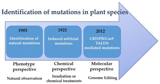 The term “mutation” was coined in 1903 by Hugo de Vries in his book entitled Die Mutations Theorie (Theory of mutation) to describe the variations of phenotypes that were observed in the plant species Oenothera lamarckiana [5]. Mutations drive the drift of evolution and plant breeding [6]. Moreover, it is said that mutation is at the bottom of cutting-edge plant breeding techniques [3]. This phenomenon occurs in living organisms naturally through repairing genetic materials, i.e., DNA & RNA damaged by physical, chemical, and biological agents [2,7]. This term was contrived by Hugo De Vries as the abrupt substitutions in either DNA or RNA of a plant organ with no recombination or separation [5]. The derived mutation profile is called a “mutant” [8]. Mutations are the leading method in evolution [9]. They lead the modified DNA & RNA inherited by the organisms into phenotypic transformations [8]. In addition, induced genetic variability by mutation using irradiation and treatment with chemical mutagens does not imply any gene insertion, unlike genetically modified organisms (GMO) [10]. Mutation breeding has been used by plant breeders since the discovery in 1925 that heritable mutations could be induced in plants by means of irradiation or chemical treatments, and is considered as a non-transgenic crop in countries where transgenic plants are denied [11] (Figure 1).