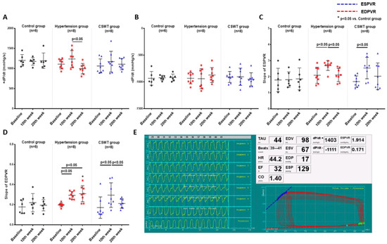 Invasive hemodynamic assessment was performed to evaluate cardiac function at baseline and in the 10th and 20th weeks [23,24]. In brief, a 7-Fr combined catheter-micromanometer (Millar instruments, Houston, TX, USA) was advanced into the LV apex via the femoral or carotid artery. A cardiac function analyzer (CFL 512, CD Leycom) was then connected to the catheter. LV positive and negative dP/dtmax, end-systolic pressure–volume relationship (ESPVR) and end-diastolic pressure–volume relationship (EDPVR) were recorded to assess LV performance.